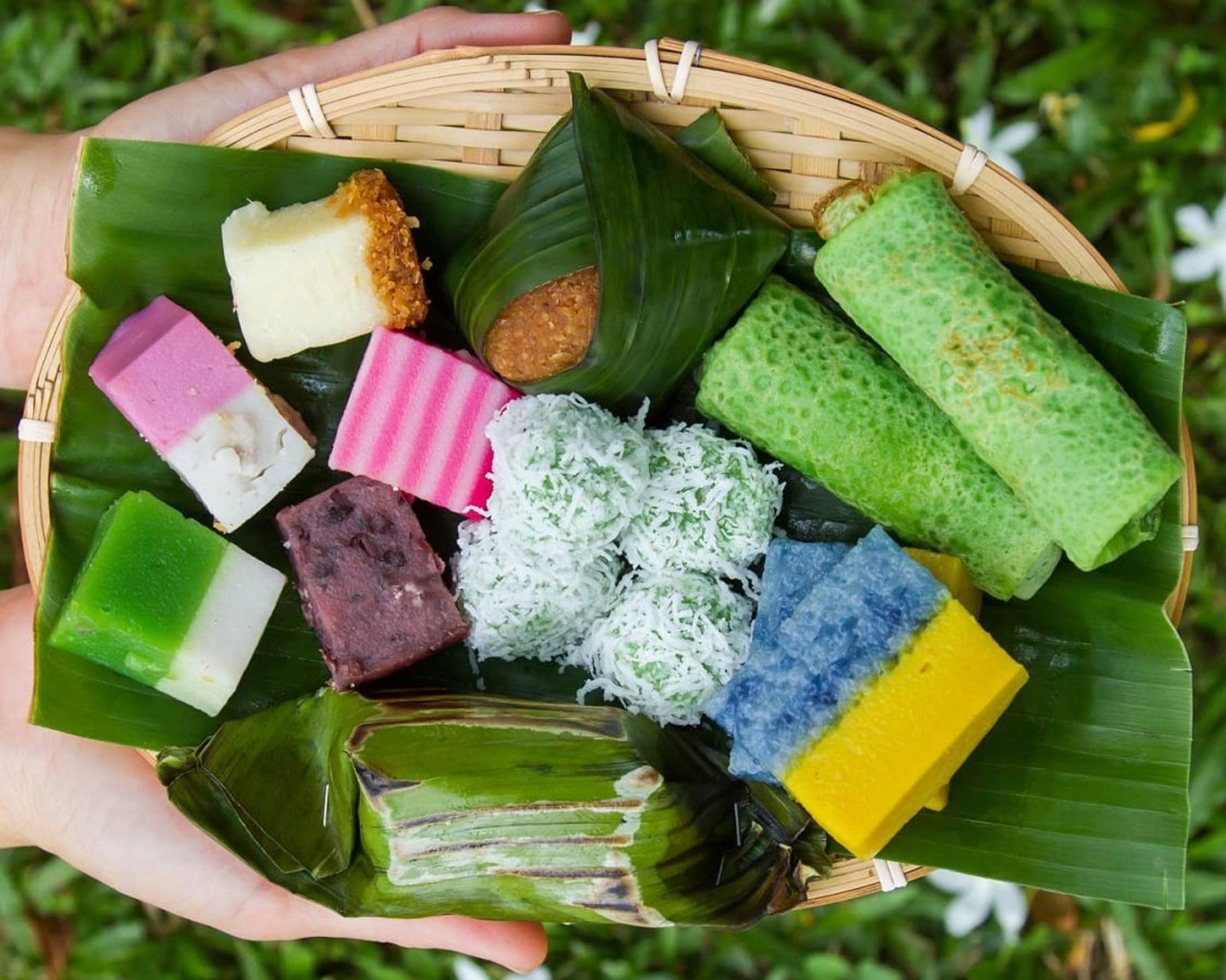 Traditional bite-sized Malay and Nyonya kuih - colorful rice cakes, coconut desserts, and pastries including apam balik, bahulu, curry puff, onde-onde, and kuih lapis.